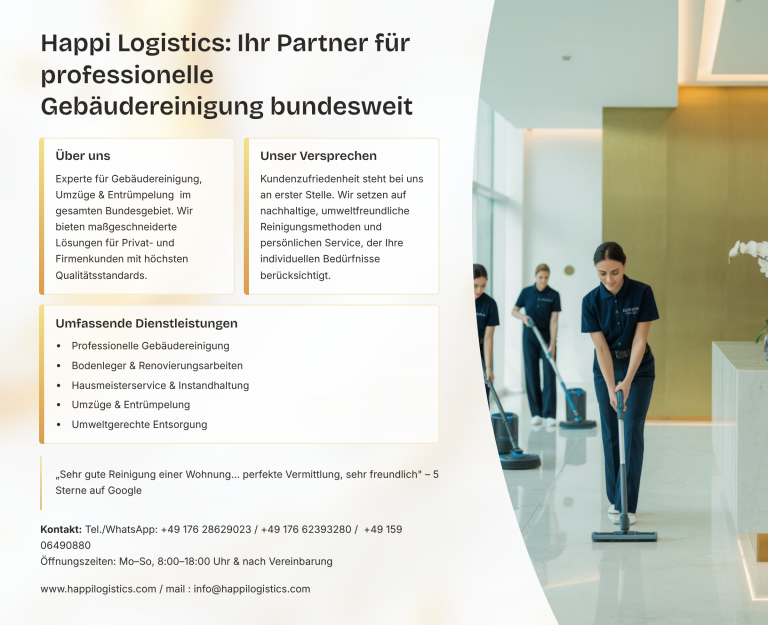 Die Unterhaltsreinigung ist die regelmäßige gründliche Reinigung Ihrer Immobilie, egal ob Privatwohnungen, Büros, Praxis, Kindergarten oder Schule, Ladengeschäfte, Bahnhof usw. in abgestimmten Zeitintervallen. Unser Unterhaltsreinigungsservice umfasst die Reinigung aller freiliegenden Bodenflächen und die Entfernung von Staub auf Möbeln, Gegenständen und Oberflächen. Wenn Sie die perfekte Mischung aus Sauberkeit, Hygiene und Kosteneffizienz suchen, nehmen Sie Kontakt mit uns auf und Sie brauchen sich keine Gedanken mehr über die Sauberkeit Ihres Objekts zu machen.